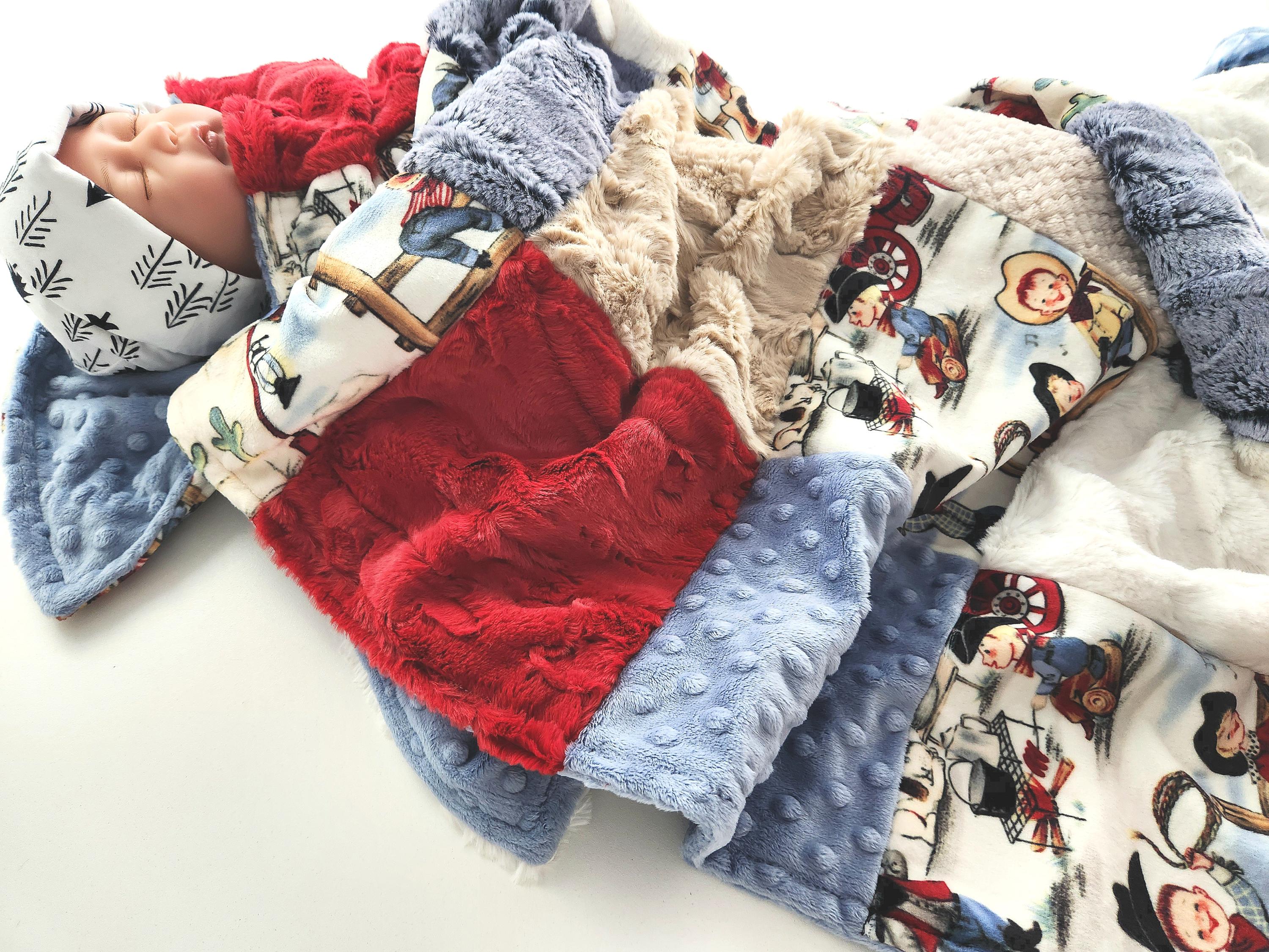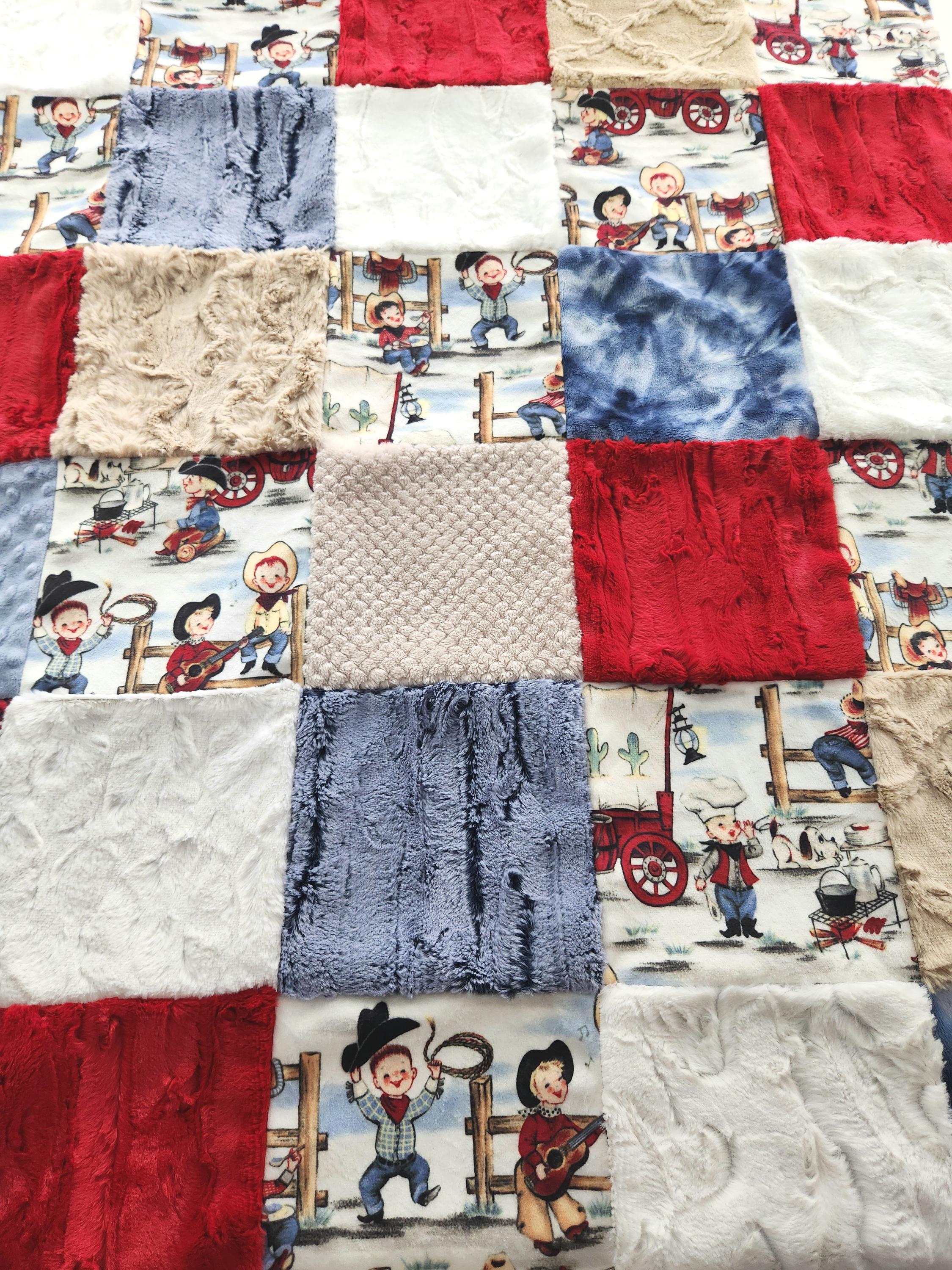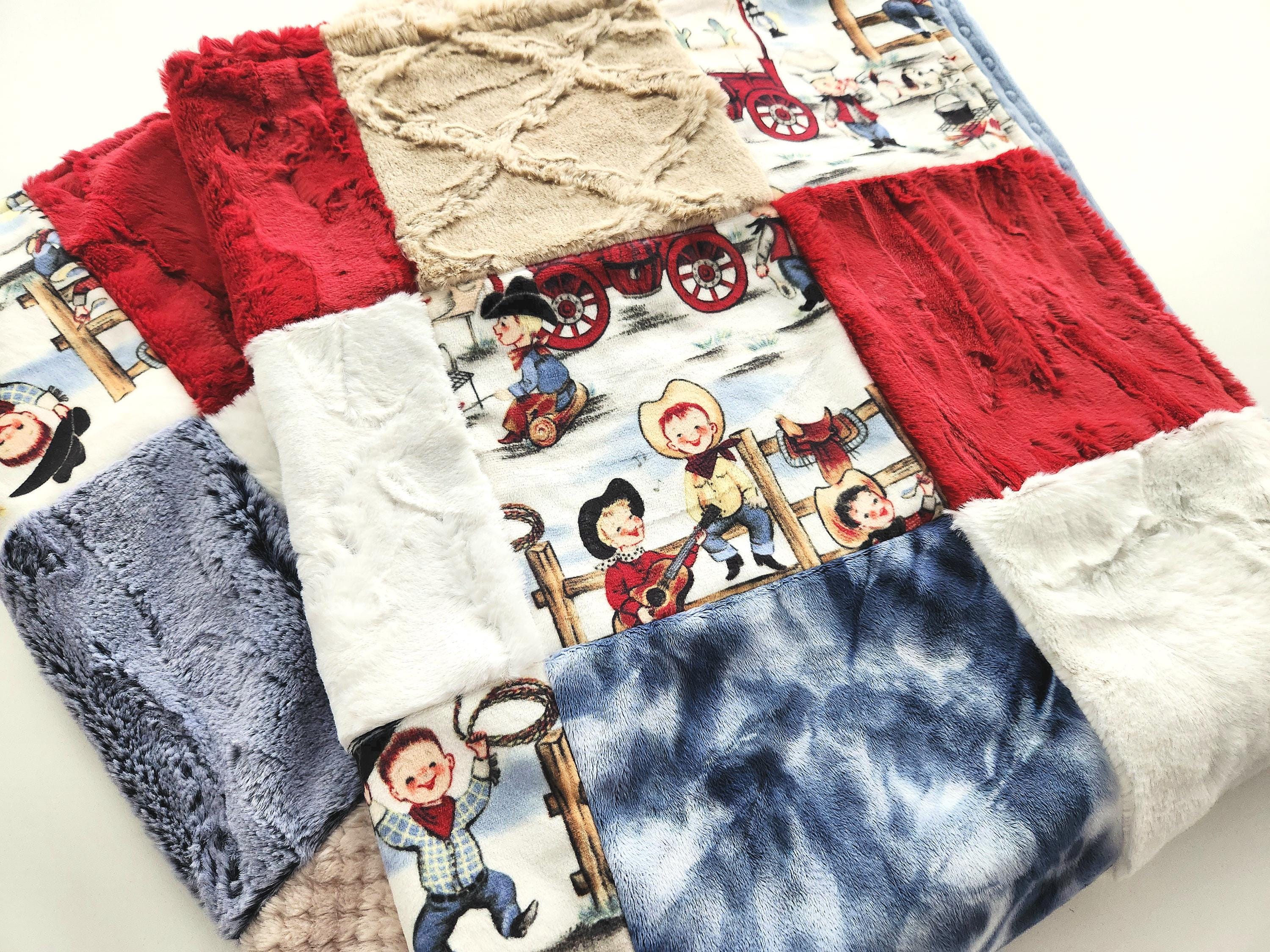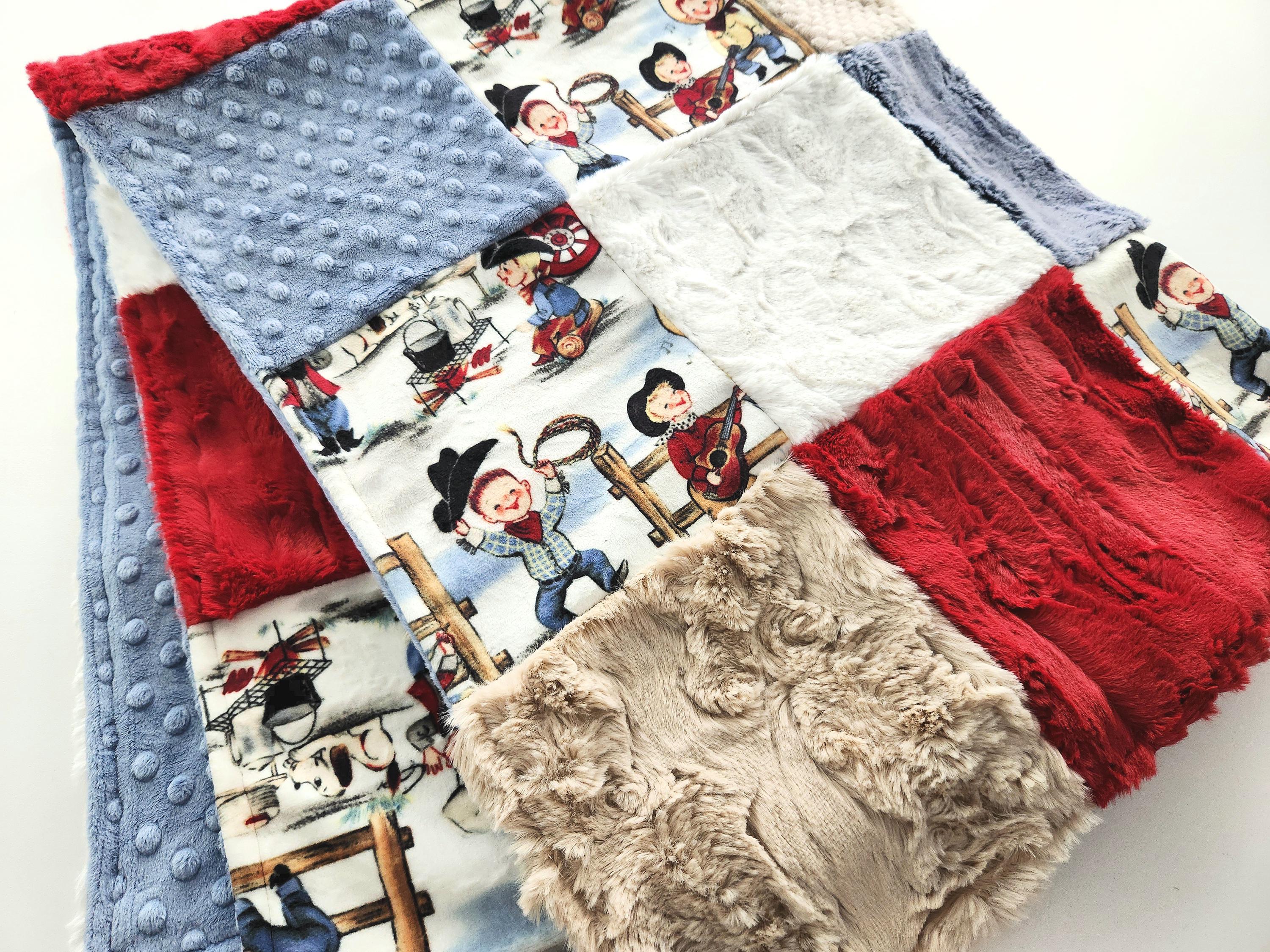 Vintage Cowboy Patchwork Minky Baby Blanket - 35"X41"