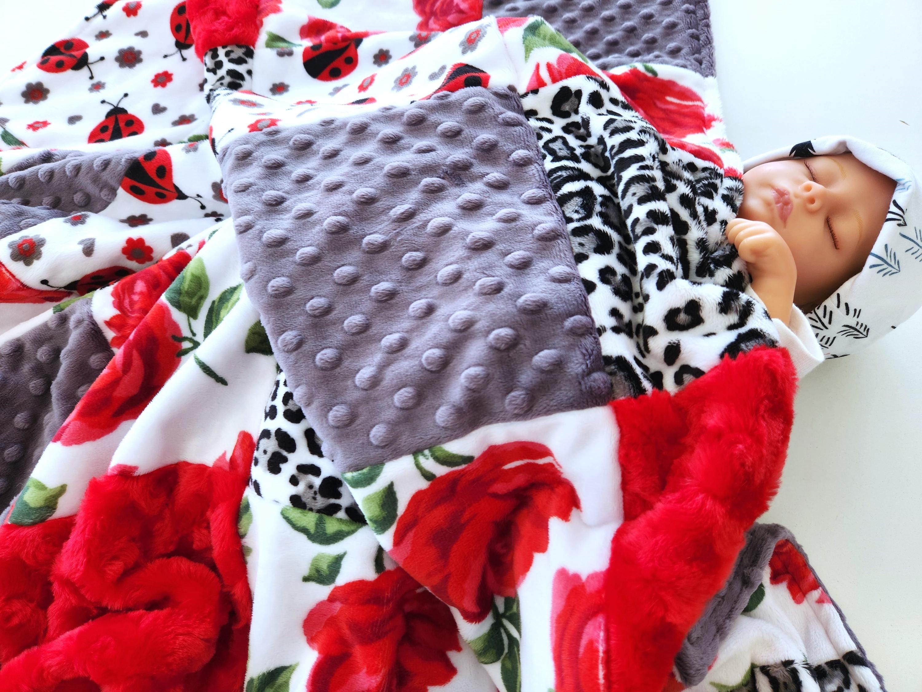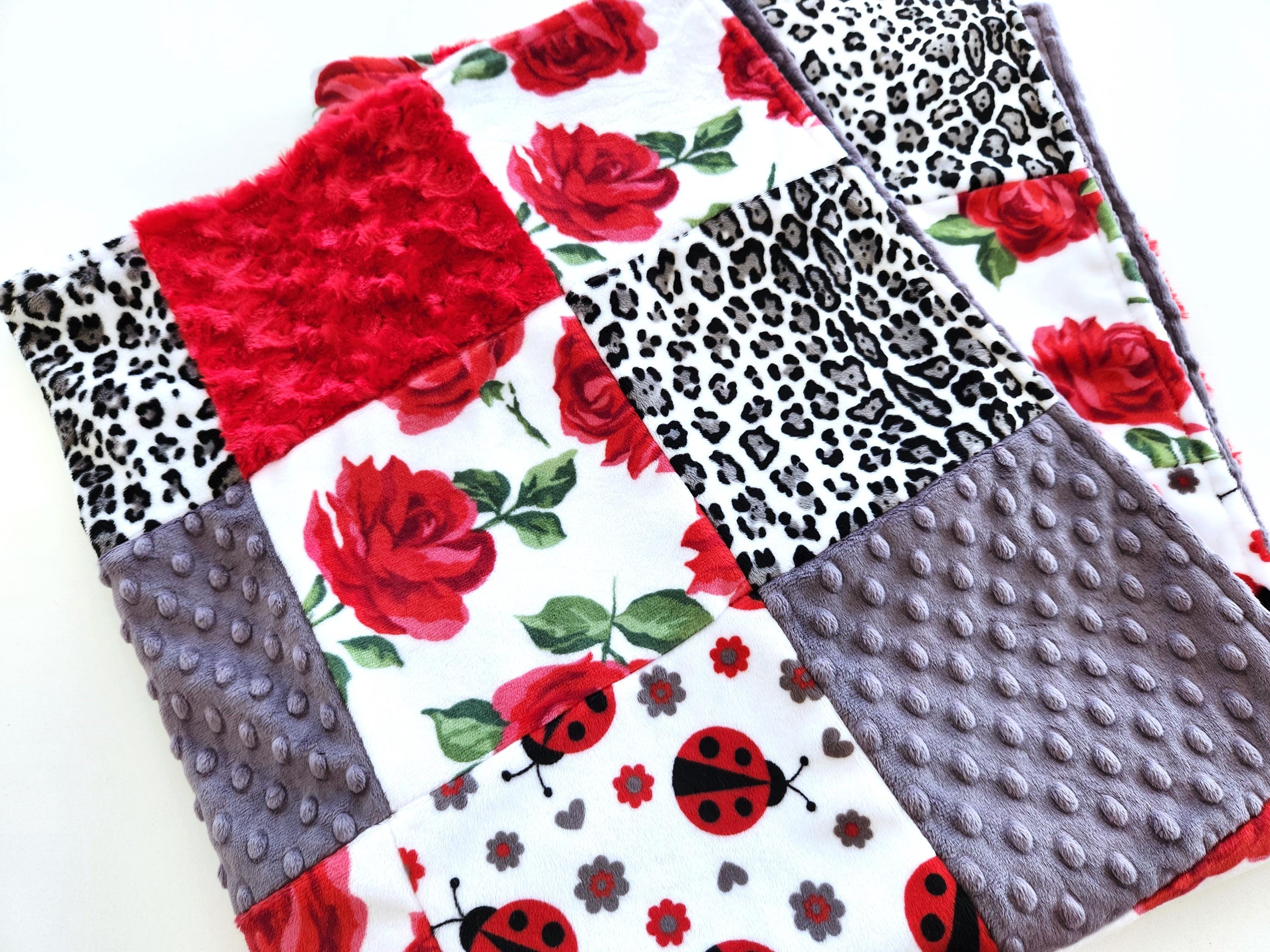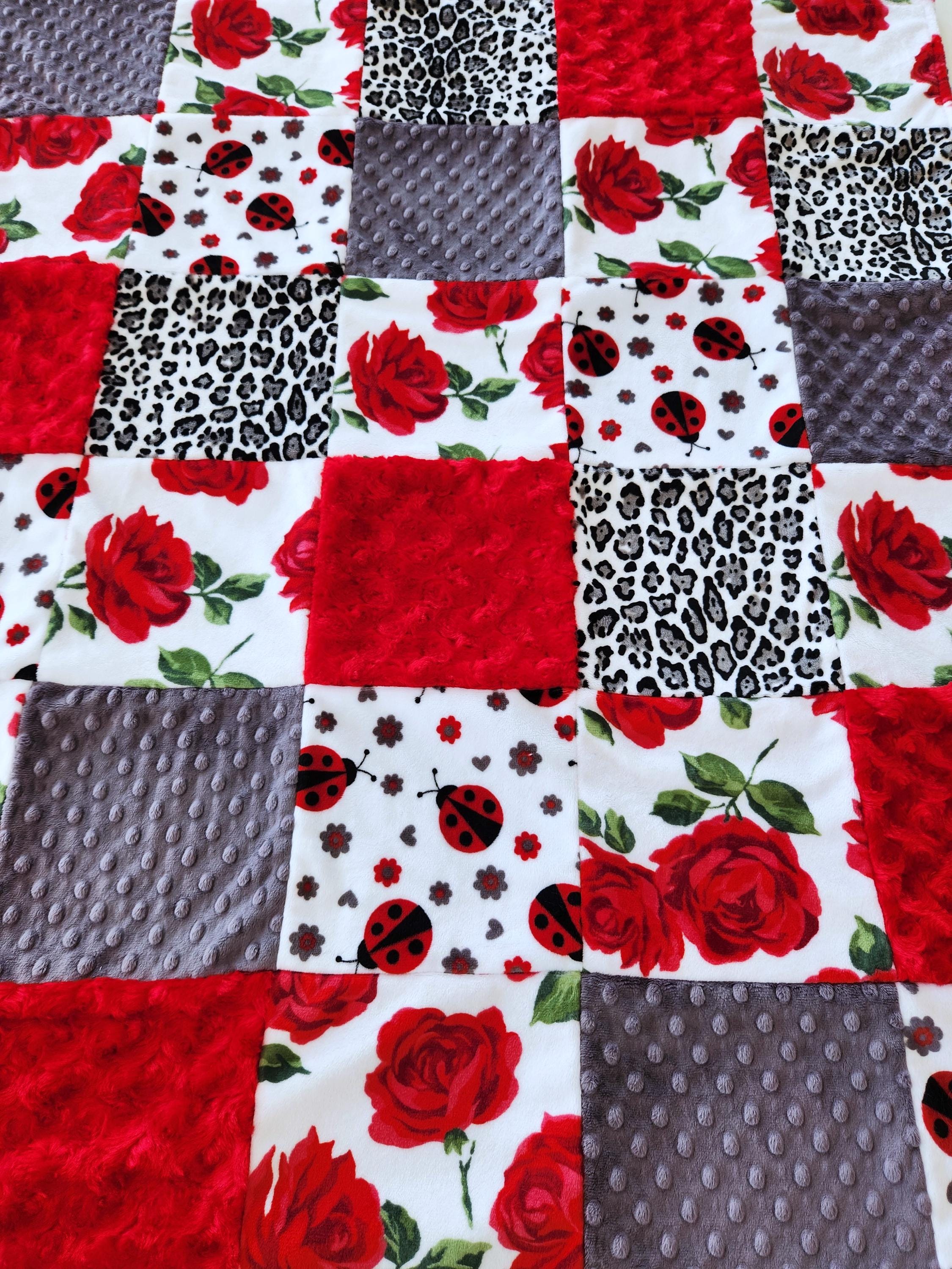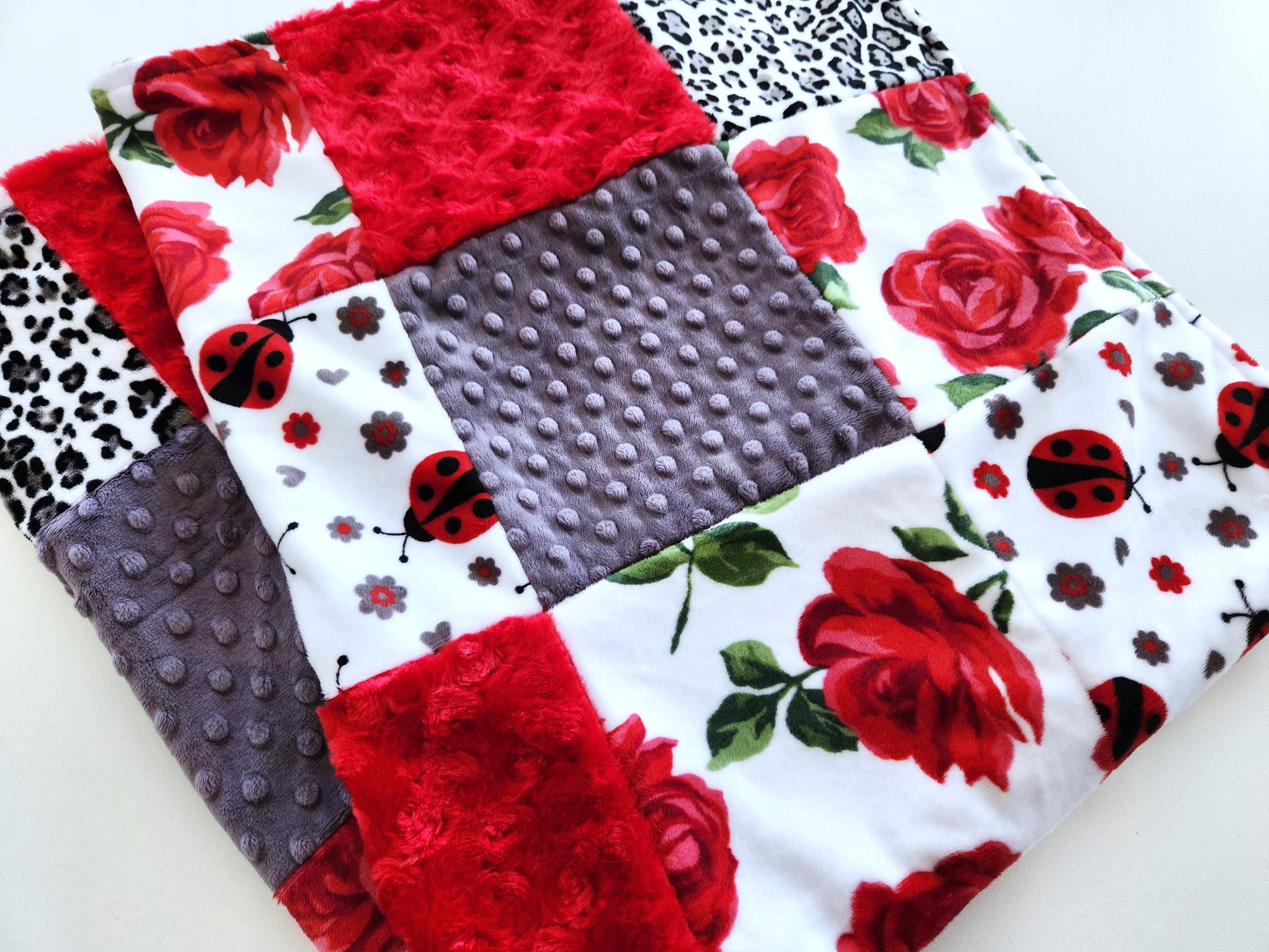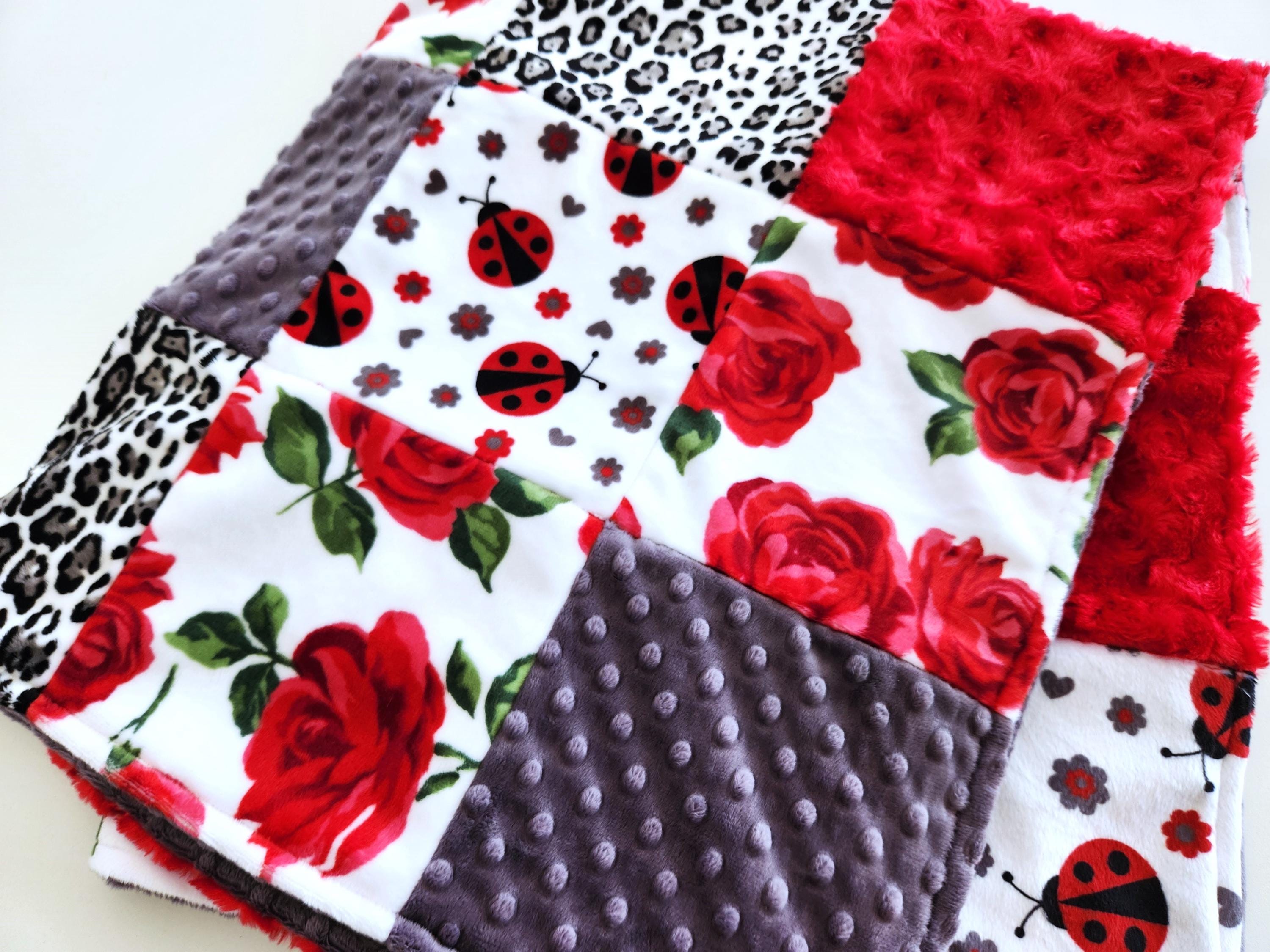 Rose and Ladybug Minky Patchwork Baby/Toddler Blanket - 35"X41" Soft, Plush